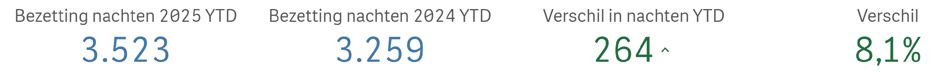 - Nachten {vergelijkjaar} YTD – totaal t/m overeenkomstige kalenderdag in het vergelijkjaar (zoals in grafiek 1).