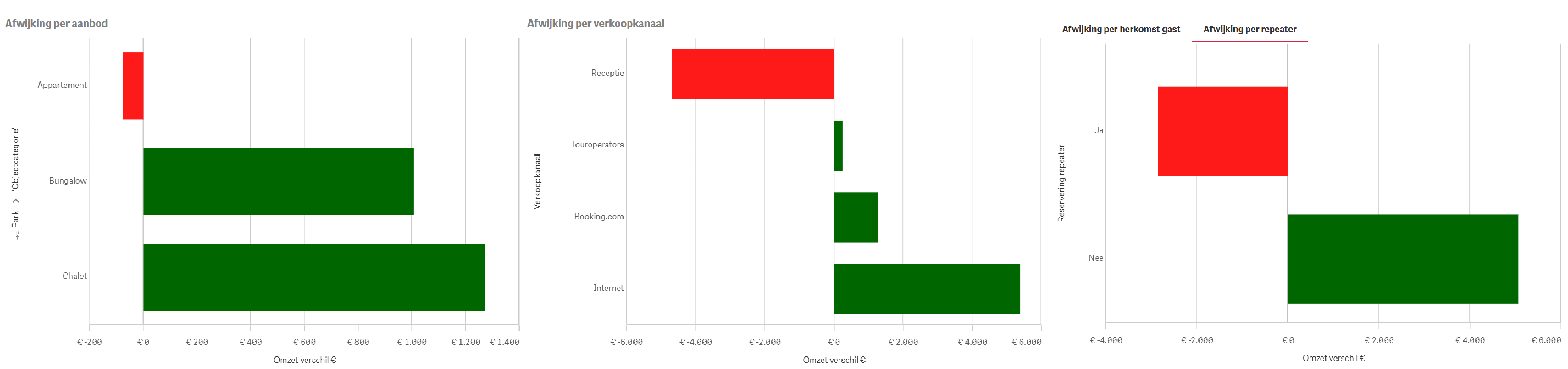 Een verticale staafgrafiek die de afwijking laat zien per aanbod niveau, met mogelijkheid om door te klikken: park - objectcategorie - objecttype. De staven zijn oplopend gesorteerd op afwijking (negatief naar positief).