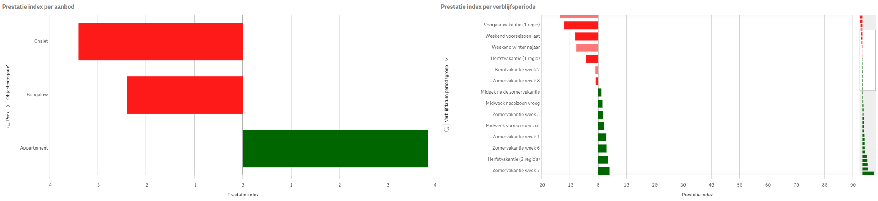 Een verticale staafgrafiek met per aanbod niveau de prestatie‑index. Je kunt doorklikken van park naar objectcategorie naar objecttype. Kleur: groen = positief, rood = negatief.