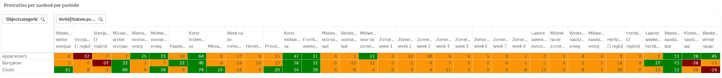 Een tabel/heatmap met rijen = aanbod (met drill‑down) en kolommen = verblijfsperiode (cyclisch). De celwaarde = Prestatie‑index met kleurcodering: